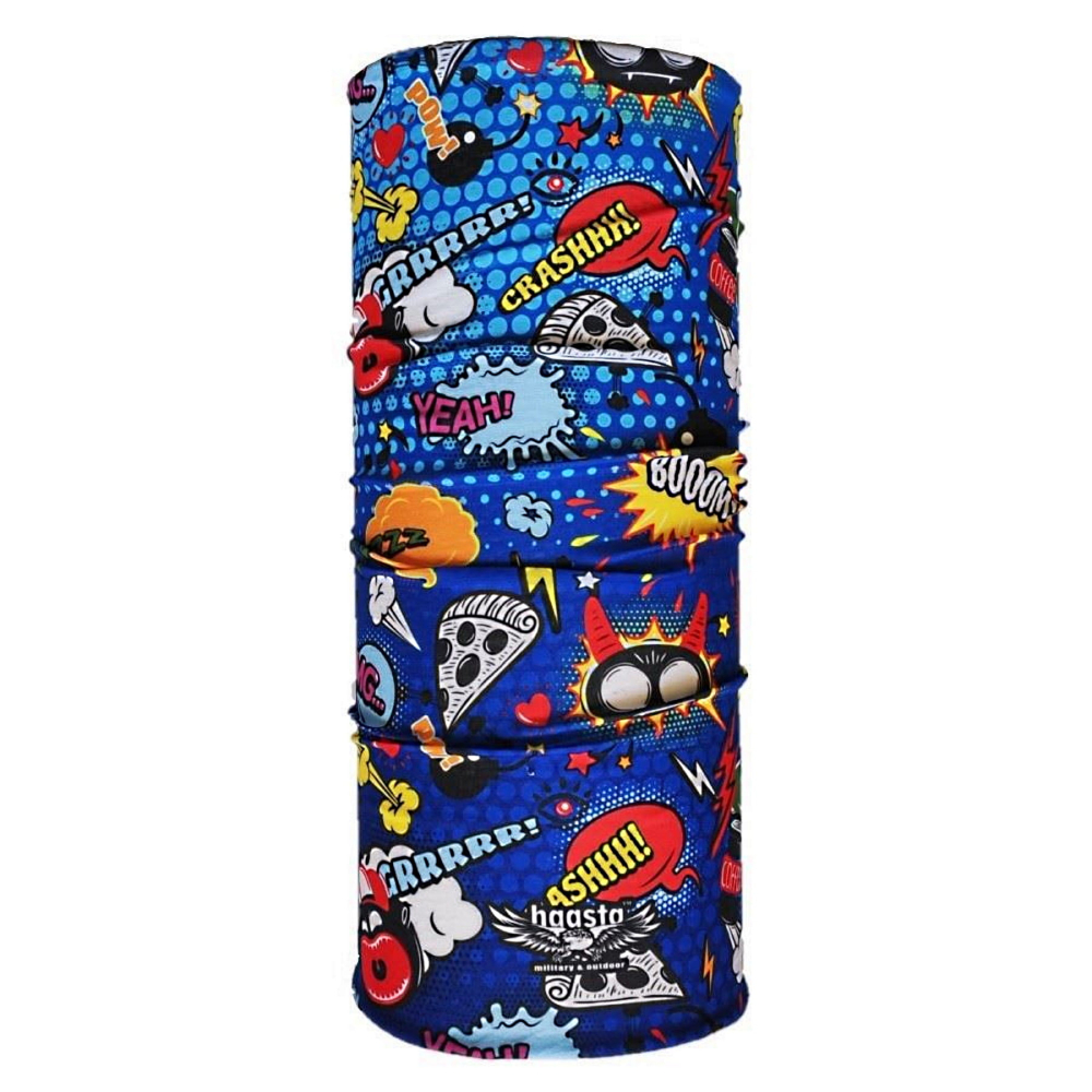 Chusta wielofunkcyjna polskiej marki Haasta we wzorze „Comics” to propozycja dla osób, które lubią wyróżniać się dynamicznym i kolorowym stylem. Nadruk inspirowany estetyką komiksową (onomatopeje typu „CRASH!”, „BOOOM!”, „YEAH!”) sprawia, że jest to nie tylko element odzieży technicznej, ale i wyrazisty dodatek do codziennego ubioru. Idealna dla miłośników sportów miejskich, biegaczy oraz turystów z poczuciem humoru.