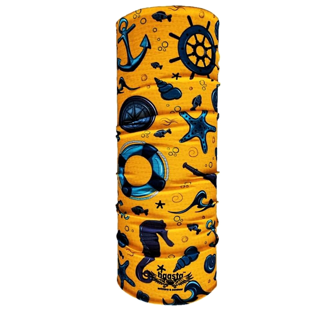 Chusta wielofunkcyjna polskiej marki Haasta we wzorze „Marinero” to propozycja dla miłośników żeglarstwa, sportów wodnych oraz wakacyjnego klimatu. Wyrazisty nadruk na miodowym tle przedstawia klasyczne marynistyczne motywy: kotwicę, koło sterowe, kompas, koło ratunkowe, konika morskiego oraz rozgwiazdy. To idealne połączenie funkcjonalnego akcesorium outdoorowego z unikalnym, letnim designem.