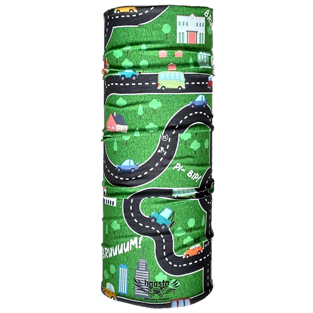 Chusta wielofunkcyjna polskiej marki Haasta we wzorze „Miasto” to barwny i pobudzający wyobraźnię dodatek, stworzony z myślą o dzieciach. Nadruk przedstawiający kręte drogi, różnorodne samochody, budynki i tereny zielone zamienia praktyczny element garderoby w mobilną mapę do zabawy, która umili każdą wycieczkę i spacer.