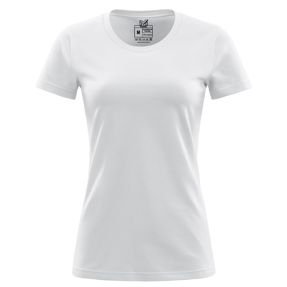 Koszulka posiada dopasowany, kobiecy fason, który podkreśla sylwetkę, zachowując jednocześnie wygodę noszenia. Okrągły, prążkowany dekolt 1x1 oraz wzmocnione, kryte szwy przy kołnierzyku gwarantują trwałość i odporność na deformacje nawet po wielu praniach.