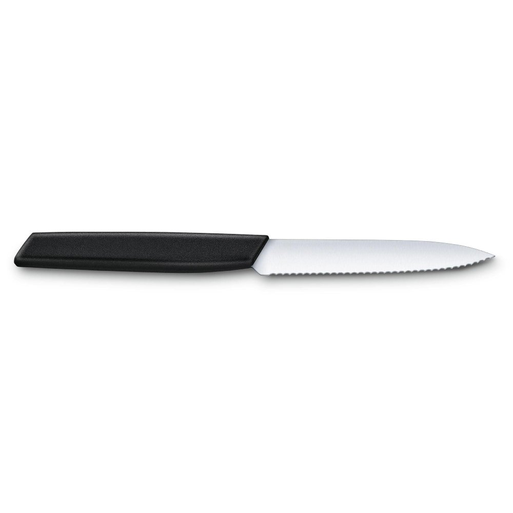 Victorinox Swiss Modern to nowoczesny nóż kuchenny zaprojektowany z myślą o codziennym gotowaniu. Wyposażony w ząbkowane ostrze ze stali nierdzewnej o długości 10 cm, doskonale radzi sobie z krojeniem warzyw i owoców, zarówno tych z twardą skórką, jak i delikatnym wnętrzem. Sprawdzi się przy siekaniu, porcjowaniu i krojeniu w kostkę, łącząc precyzję i łatwość użycia.