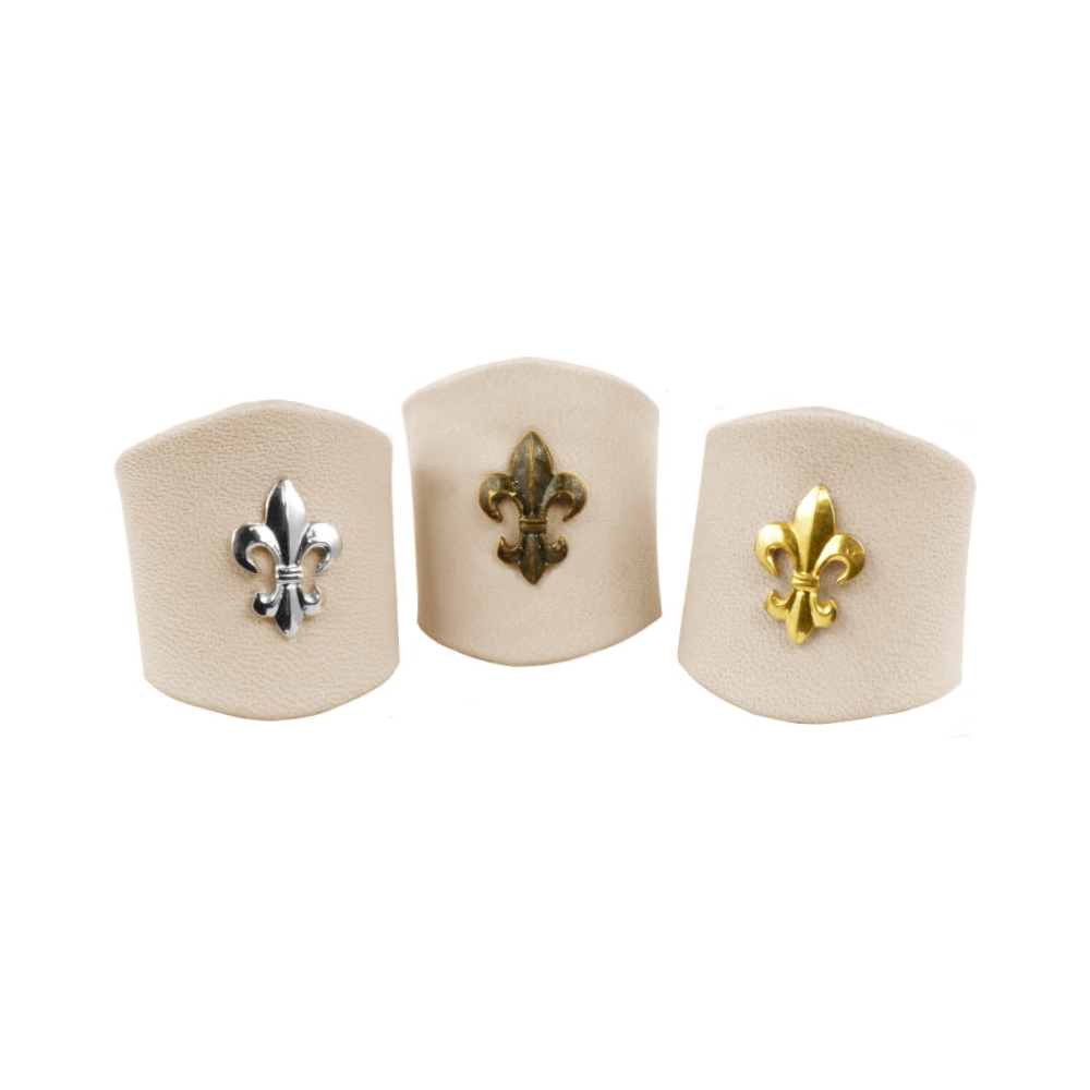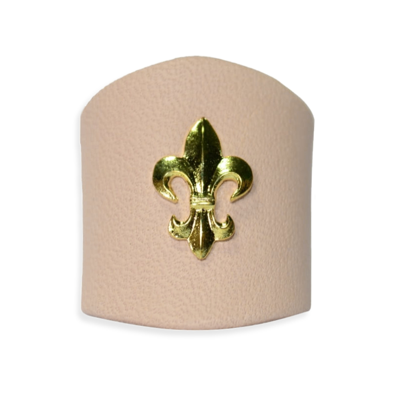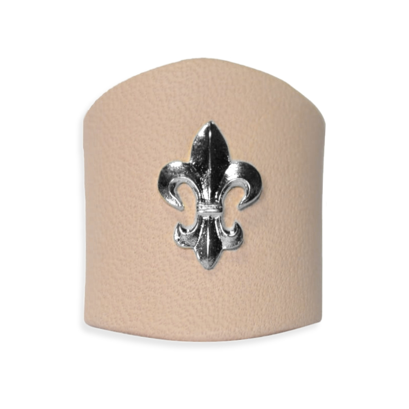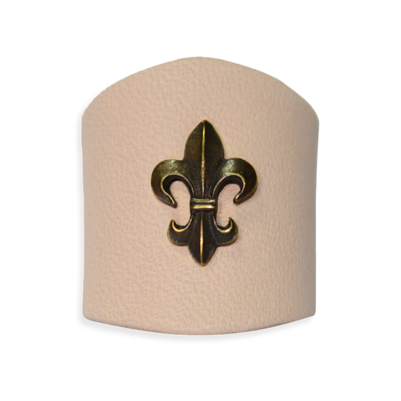 Pierścień skórzany z przynitowaną małą metalową lilijką. Wykonany jest z naturalnej skóry spiętej mocnym nitem, dzięki czemu pierścień przetrwa wiele lat użytkowania.