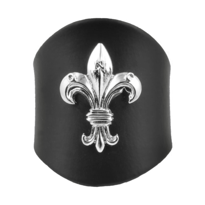 Pierścień z przynitowaną metalową lilijką. Wykonany jest z naturalnej skóry spiętej mocnym nitem, dzięki czemu pierścień przetrwa wiele lat użytkowania.
