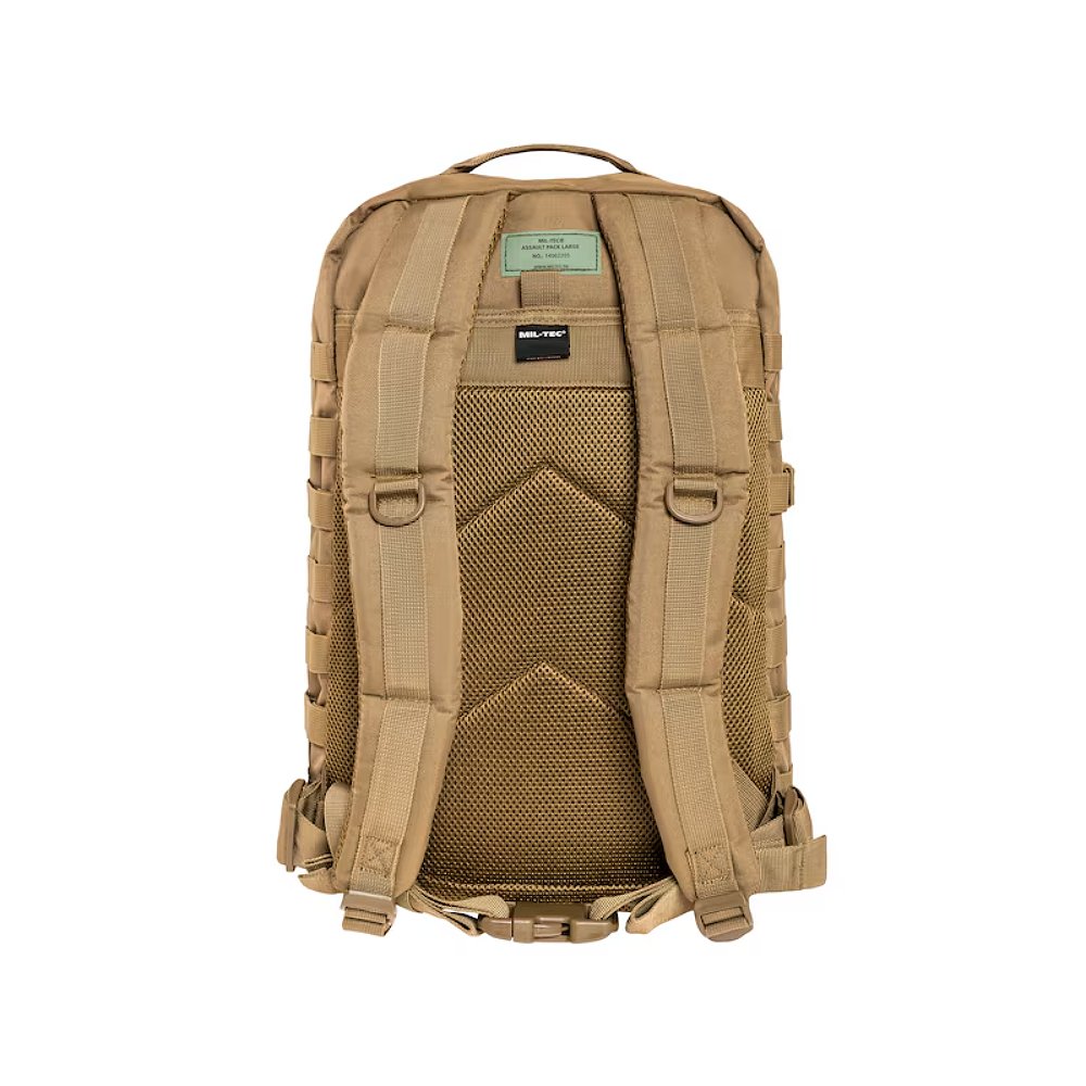 Mil-Tec Assault Pack Large w kolorze Coyote Brown to solidny plecak taktyczny o pojemności 36 litrów. Wykonany z poliestru odpornego na przedarcia, posiada wewnętrzną powłokę PVC, która skutecznie chroni ekwipunek przed wilgocią. Jego piaskowy odcień oraz funkcjonalność sprawiają, że jest to doskonały wybór zarówno do działań w terenie, survivalu, jak i intensywnego użytkowania codziennego.