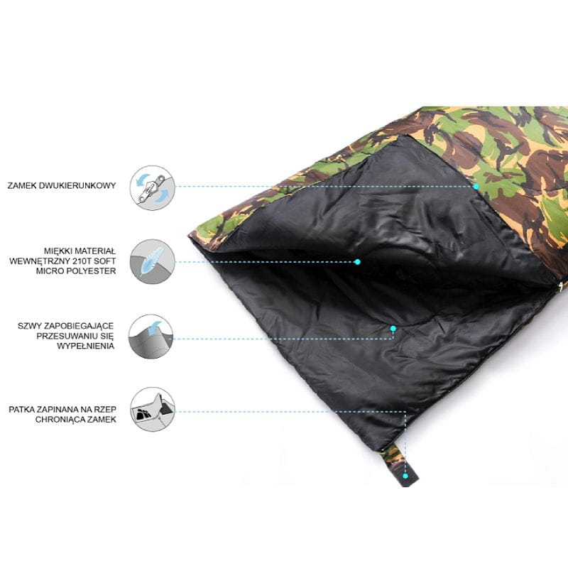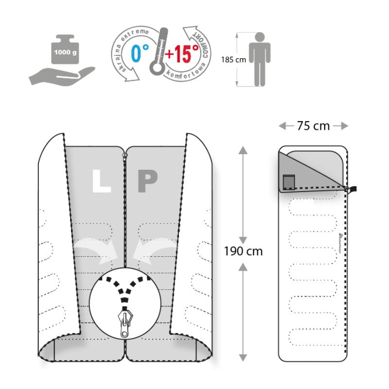 Model ten występuje w dwóch wersjach: z zamkiem po prawej i po lewej stronie. Dzięki temu istnieje możliwość połączenia śpiworów ze sobą.