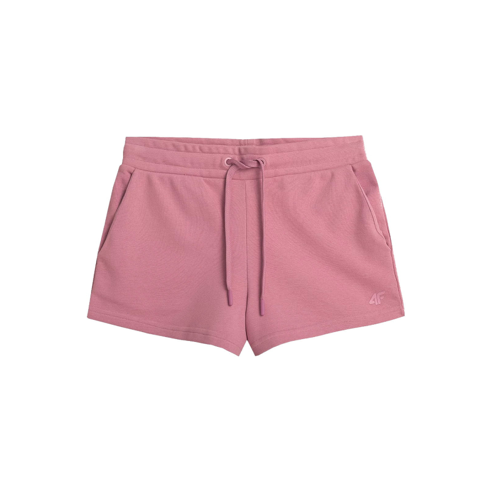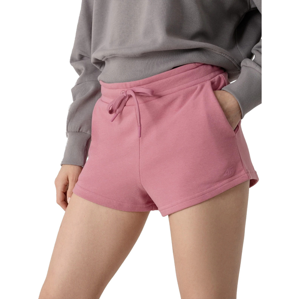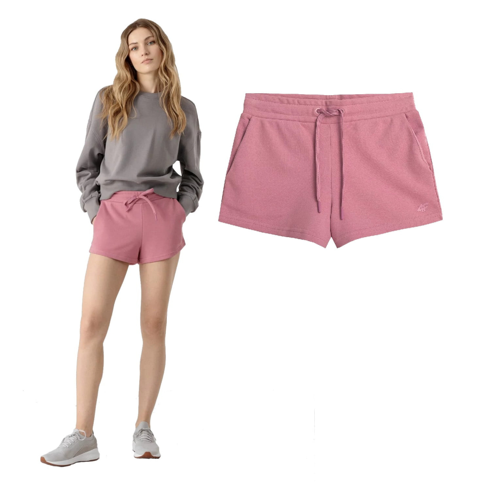 Spodenki pochodzą z linii NOS (klasyczna baza produktowa 4F), co gwarantuje sprawdzony krój i uniwersalność. Jasnoróżowy kolor nadaje całości świeżego, kobiecego charakteru, który świetnie komponuje się z białymi t-shirtami lub dopasowanymi topami.