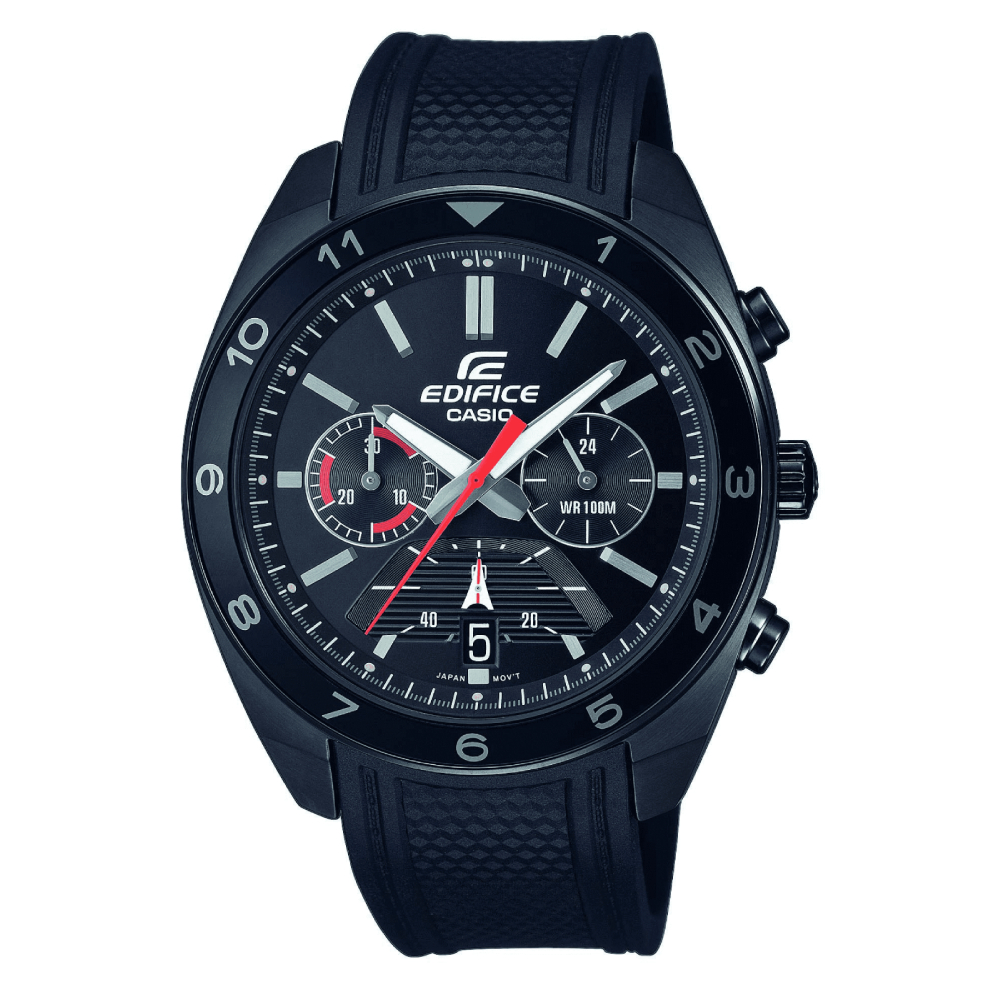 Nowoczesny męski zegarek Casio Momentum Classic Sporty Chronograph z eleganckiej serii Edifice, został jednocześnie zachowany w sportowym stylu, odbiegającym nieco od założeń serii. Doskonale nadaje się jako uzupełnienie sportowego stroju. Gumowa struktura paska doskonale leży na ręku, nie ześlizgując się oraz nie przeszkadzając podczas aktywności.